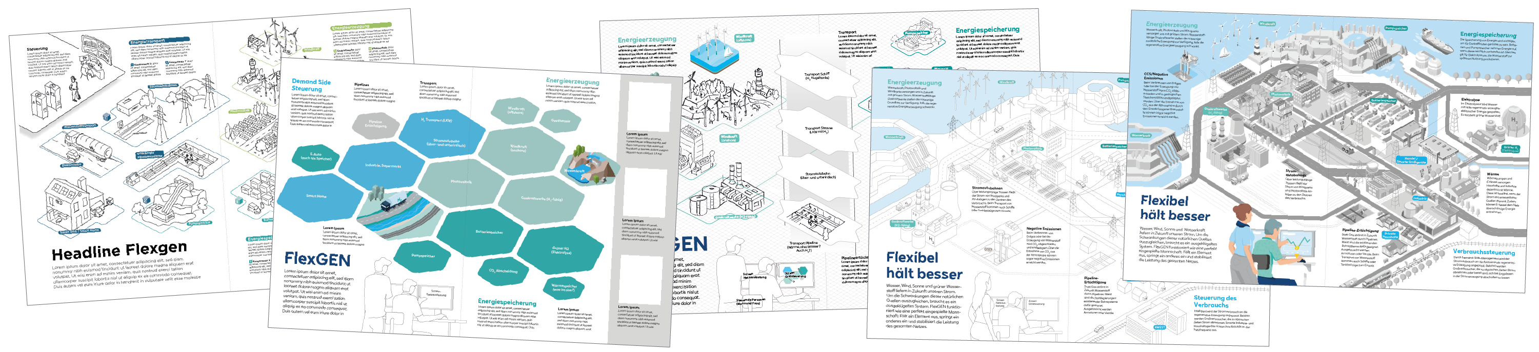 Normalerweise läuft es in meiner Arbeit oft andersherum: Erst wird das Bild erstellt und dann kümmert sich ein Redakteur um die Texte. Das führt oft dazu dass Textelemente wichtige Bild-Bestandteile verdecken oder schlecht zu lesen sind. In diesem Fall war das anders, von Beginn an wurden dem komplizierten Thema gerecht werdende Textmengen mit entsprechendem Platzbedarf eingeplant. Links ein paar Details, unten Skizzen, Scribbles und Zwischenversionen.